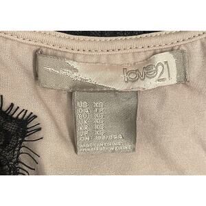 This Forever 21 tank top in size XS features a black and beige layered lace design with a V-neckline. The sleeveless, pullover style is suitable for various occasions, including travel, weddings, parties, and work. Made of nylon and polyamide lace fabric with fringe accents, this babydoll tank has a Y2K-inspired, bohemian theme and a regular fit. It is machine washable and suitable for all seasons due to its breathable material. Pit to pit is 14 inches. Top of shoulder to bottom is 21 inches.