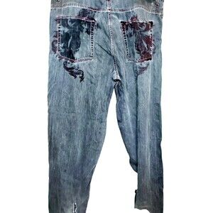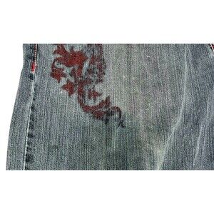 These Y2K black baggy jeans by Evolution in Design, mens size 44, showcase iconic faded red dragon prints for true vintage streetwear appeal. Crafted with a relaxed, wide-leg fit and intentionally distressed wash, they capture the bold, grunge aesthetic of the early 2000s. Unique fading and bold dragon graphics make these jeans a standout piece for any retro-inspired collection. See the photos for all details on color, dragon print, and wear. Perfect for festivals, collectors, or anyone chasing authentic millennium-era style from the Evolution in Design brand.