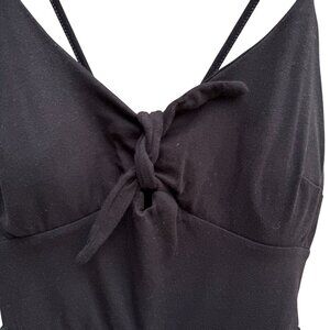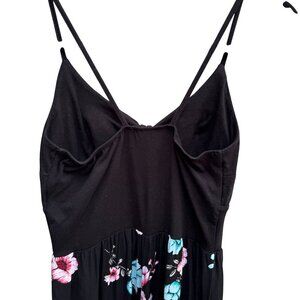 This sleeveless maxi dress features a black base with vibrant floral prints, spaghetti straps, and a knot detail at the bust. Designed for comfort and style, it's suitable for various occasions.