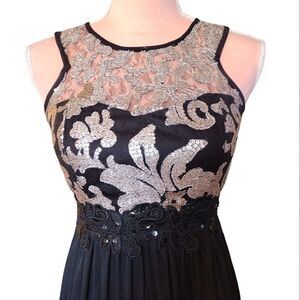 Beautiful formal gown, in black with gold sequins detailing. High mesh neckline, shimmery metallic & gold sequins, with a black floral applique bodice. Sleeveless. Black mesh overlay skirt, fully lined. Floor, maxi length. Keyhole button & hidden zipper, back closures. 100% Polyester
