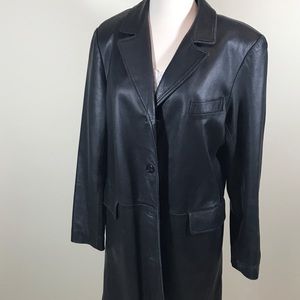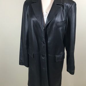 Black all genuine leather long trenchcoat. Well worn but lots of life left!