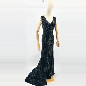 This show-stopping evening gown dazzles with allover sequin embellishment and features a plunging V-neckline with a sultry satin lace-up corset back with structured boning for a figure-hugging, customizable fit and dramatic train.