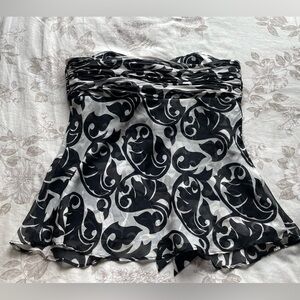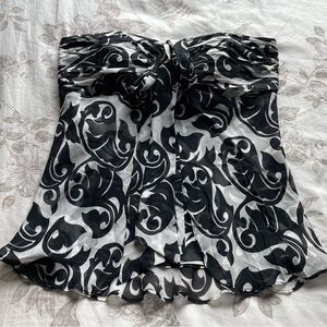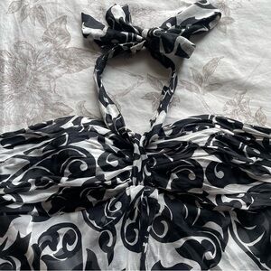 Gorgeous Y2K era top from White House black market. Can be worn strapless and bow tied in the front or tied around the neck in a halter style. Chiffon is split in the front but has a satin layer underneath but gives it a pretty effect. Has a gummy textured line across the top inside to help it stay up.