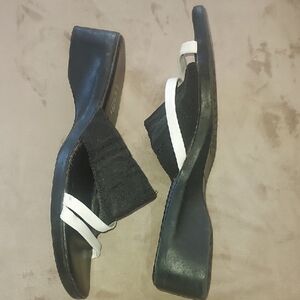 womans size 7 Judith vintage retro small platform black sandals with white pleather strap!