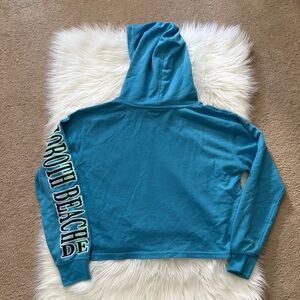 Chic teal hoodie with a striking butterfly design. Ideal for everyday comfort. Light and cropped, almost like a very light terry inside. Graphic has no cracking. No holes or stains. Has some wash wear and pilling. Y2K mcbling style.