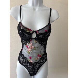 Y2K Bodysuit Small Sheer Lace Floral Embroidered Black Mesh Open Back Lingerie