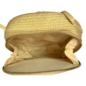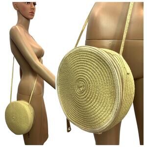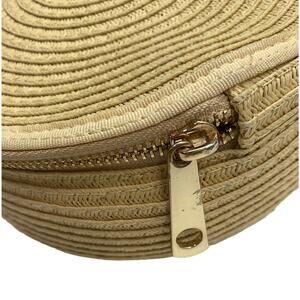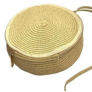 Cute little round straw bag, woven with ribbon edging, gold zipper. Lined with no interior pockets. Has long strap, shoulder or crossbody.