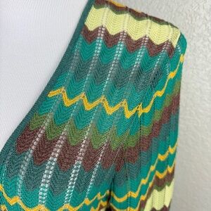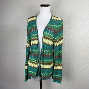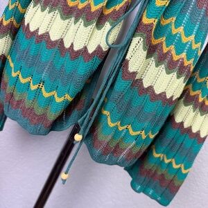 Tags: preworn, adjustable, 2000s, 90s, crochet, funky, retro, hippie, hippy, casual chic, earthy, festival, festie, boho, boho-chic, bohemian, lightweight, breathable, babydoll, layer, layered, layering, indie, breezy, flowy, dainty, feminine, spring, springtime, summer, summertime, vacation, travel, coastal, beaded, teal, turquoise, brown, yellow, green, belt, belted, chevron, groovy, stripe, striped, stripes, knit, thin, open front, vintage cardigan, retro knit, tie front sweater, wooden bead cardigan, boho festival cardigan, Y2K knitwear, hippie cardigan, teal cardigan, green knit sweater, striped knit cardigan, lightweight boho sweater, open front cardigan, crochet-style cardigan, colorful knit cardigan, 90s inspired cardigan, indie style sweater, festival outfit layering, beach cover cardigan, coastal bohemian cardigan, funky stripe sweater