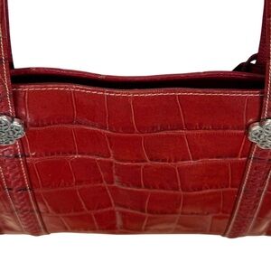 Brighton genuine leather shoulder/tote bag in a rich red croc-embossed finish. Features Brighton’s signature silver heart charm, double straps for shoulder carry, structured silhouette with an elegant shine. A stylish piece that stands out in any collection. Interior pocket, and hardware in silver tone.