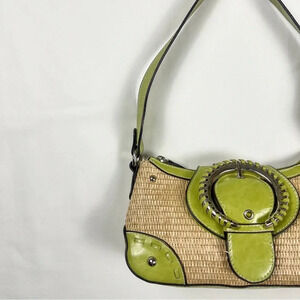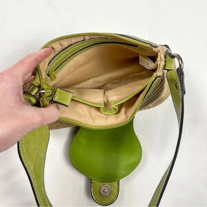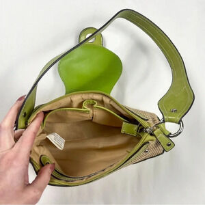 green & tan woven material shoulder bag with a faux leather single shoulder strap