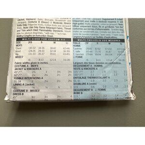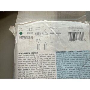 Men's and Misses' multi-sized costume sewing pattern includes a lined jacket, knickers, and an A-line dress. Features gold accents, off-shoulder ruffles, and complete material guidelines.