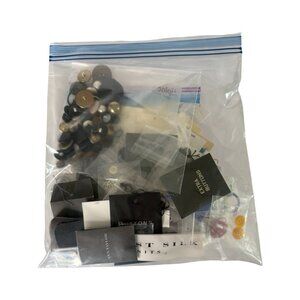 Large lot of vintage and Y2K-era extra buttons, fabric swatches, and sewing notions from popular fashion brands like Banana Republic, Ann Taylor, Alfani, LOFT, Style & Co., and more. Includes over 30 branded button packets, fabric swatches in neutral tones, a bag of loose buttons (metal, pearl, and novelty styles), thread cards, and some vintage cards like La Mode and Streamline