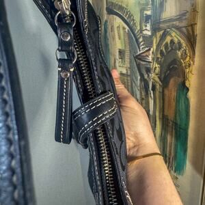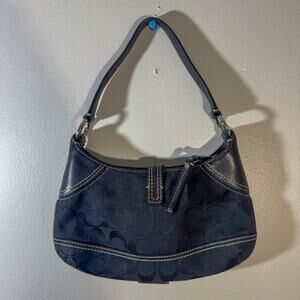 Coach, vintage, Y2K, 90s, 2000s, signature C, monogram, jacquard, black, white stitching, contrast stitch, shoulder bag, baguette, mini hobo, demi bag, soho, hamptons, silver hardware, nickel, leather trim, authentic, designer, trending, clean girl, soft grunge, nostalgic, purse.