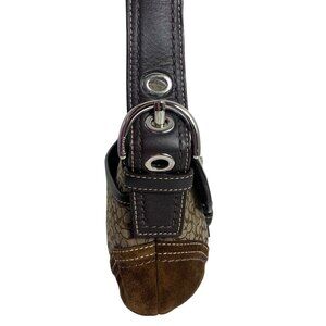 Vintage Y2K Coach Soho shoulder bag in brown signature canvas, suede and leather. Features a stylish design with adjustable strap and original tag. Perfect for adding a touch of retro elegance to any outfit.