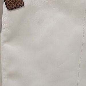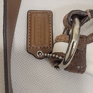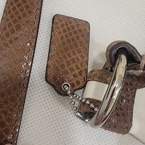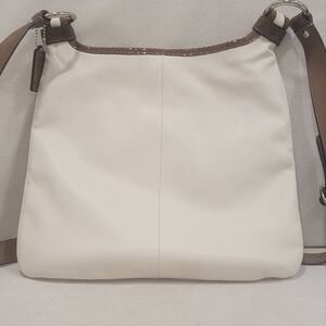 Y2K Coach Penelope ivory crossbody handbag. The bag has a single compartment with 2 slide pockets and a zippered pocket. The lining is teal satin. There is a pocket on the front. There is a small mark on the back of the bag near the top (see pic). Other than this small mark, the bag is in excellent condition. The strap is an embossed leather. Please see all pictures.