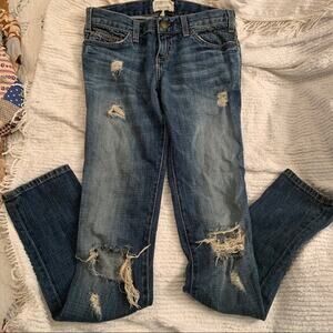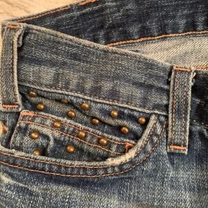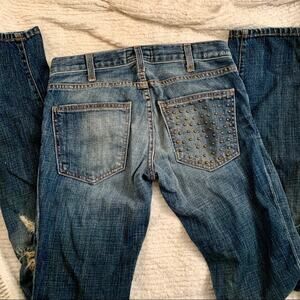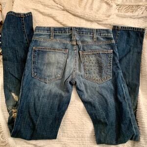 Amazing jeans with distressing and tiny brass studs on front and back pockets. waist is 14” across top, rise is just under 8”. They narrow down from 10” across each thigh to 6” across each hem. SIZE 25