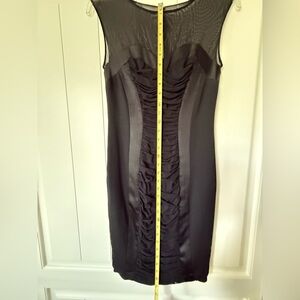 Chic black dress with mesh detailing. Backless design adds allure. Perfect for evening wear.