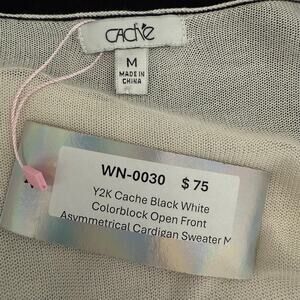 Vintage Cache black and white colorblock cardigan sweater featuring open front design and asymmetrical hem. Crafted from 100% viscose with long sleeves for cozy layering. Minimalist and casual yet office-ready, perfect for versatile Y2K-inspired looks or effortless layering.