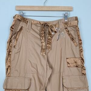 Y2K embroidered cargo cropped/capri pants from Cache, size 12 - tan brown with florals. Cotton with satin accents. Tie/sash belt. Racing stripe. Ideal for utility, 90s, gorpcore, streetwear, street style , and ankle vibes. Perfect for spring, summer, concert, festival, and going out. Pair with baby tee and platform sandals or kitten heels.