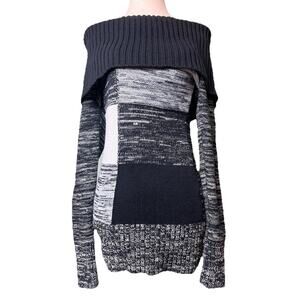 Very cute vintage Y2K cache black and white striped Colorblock fold over shoulder knit tunic sweater with long sleeves.
