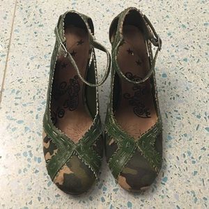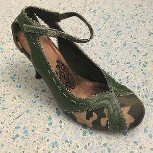 Y2K-era heels by Naughty Monkey, purchased from a boutique near UCLA in Westwood. Gently used and flattering on the foot. Features a subtle army green and camo print with beautiful stitch detailing. Comes with the original shoebox.