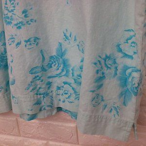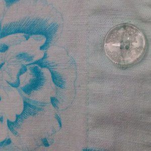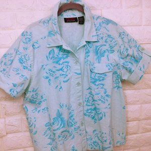 Y2K Top Shirt Cassini by Oleg Cassini Linen Floral boxy Blouse Sz-Large flap Pocket Short Roll-Tab Sleeves Collar logo Buttons-up side vents easy care linen/cotton blend in shades of Turquoise roses on Sky Blue In pre-owned* condition with no visible flaws. Summer Layer Fall Travel Cottage Farm Market Nature Prairie Lagenlook