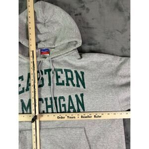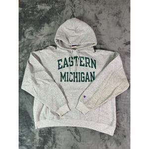* Design: Gray with "Eastern Michigan" graphic, pullover hoodie, front pocket, Champion logo on sleeve