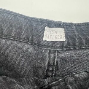 Y2K-era Charlotte Russe Melrose black wide-leg jeans with distressed details and a grunge-inspired aesthetic. These jeans feature heavy distressing on the front, a raw hem, and a high-rise, wide-leg fit, perfect for early 2000s and streetwear looks.