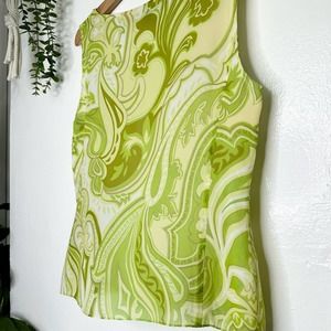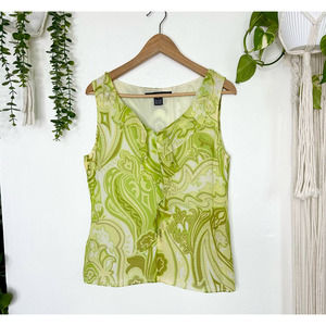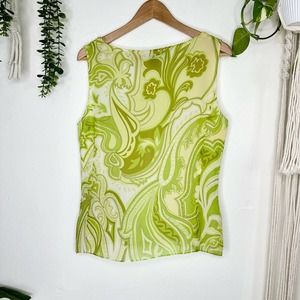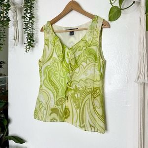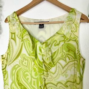 Y2K Chartreuse Lime Green Paisley Print Ruffle Chiffon Silk Tank Blouse 8