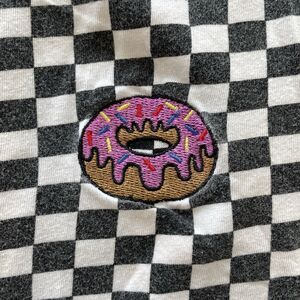 Mens tank top in black and white checkered pattern with white trim and embroidered pink frosted donut accent.