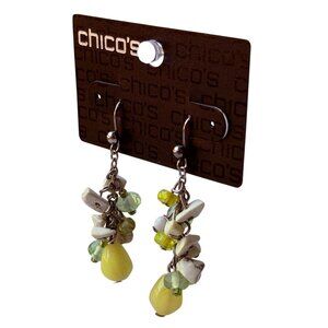 Beautiful Chico’s stone cluster dangle earrings from the early 2000s featuring natural-looking beads in soft green, pale yellow, and ivory tones. These earrings are brand new on the original Chico’s card and have a warm, organic look with mixed bead shapes and colors that mimic natural stone. They measure approximately 1 7/8" long and hang from silver-tone ear wires. Perfect for adding a bit of earthy charm to any boho, resort, or casual outfit. Shipped with tracking and careful packaging to ensure safe arrival.