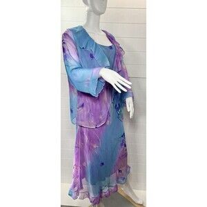 This vintage Omkara CHiFFON Ruffle DRESS & Jacket Set in Water Colors Pastel is a stunning addition to any wardrobe. The dress features a beautiful floral pattern, sleeveless design, and a round neckline with a pullover closure. The ruffle accents and sheath style add a touch of femininity, perfect for occasions such as weddings, holy communion, parties, or business events.