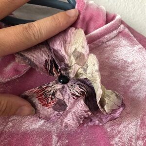 Excellent condition crushed velvet set. Comes with a long sleeve collared top and pants. The flower needs to be ironed flat and it has some dark spots from the original glue. The flower is sewn on but could be removed if it is not your style. Size 8.