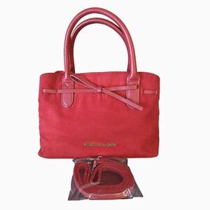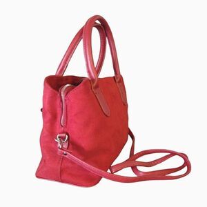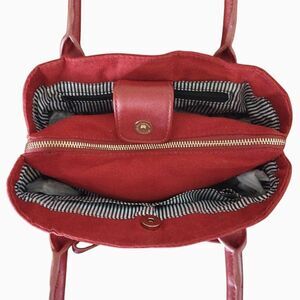 Super soft red velvet outer, trimmed in faux red leather & gold- toned hardware. Big red faux leather decorative bow, on the front. Double rounded red handles. Magnetic snap button closure, opens to 3 large departments, mid has a zipper closure. 1 inner zip pocket, & 2 open slots. White & blue striped, material lining.