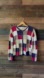 Early 2000s button-front knit cardigan in bold colorblock squares of navy, red, cream, and taupe. Soft ramie-cotton blend with a slightly cropped fit that pairs effortlessly with high-rise jeans, corduroy skirts, or over a simple turtleneck for a nostalgic fall look.