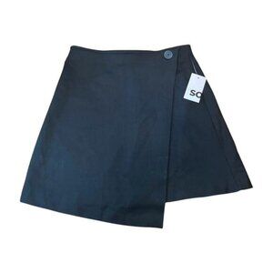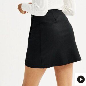 black faux wrap mini skirt in a sleek ponte knit. Featuring a flattering A-line silhouette with an asymmetrical hem, this high-waisted skirt brings a modern twist to a classic