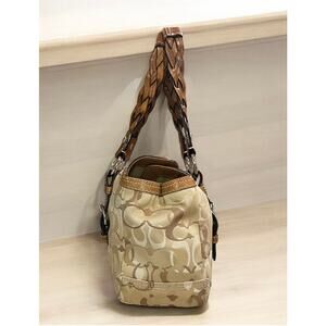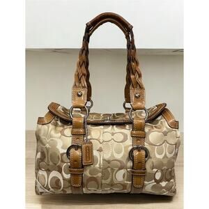 This Y2K Coach 10995 Chelsea Optic Signature Turn Lock Satchel and Checkbook Wallet from 2007 is such a Y2K Coach throwback look and style! Featuring tan Optic Signature sateen with tan leather trim and braided straps, this set is just as stylish and sought after today as it was almost 20 years ago. If you love the style and quality of Y2K Coach, you need this set in your collection!