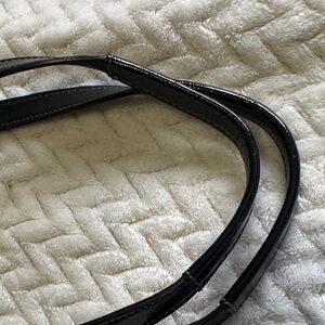 Sleek and stylish Coach shoulder bag. Features glossy black patent leather. Ideal for everyday use.