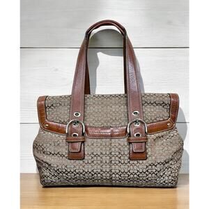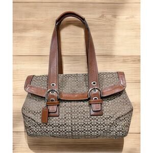 This Y2K Coach F12312 Soho Mini Signature Flap Satchel and F40585 Large Wristlet from 2008 is such a Y2K Coach look and style! Featuring Mini Signature Jacquard in the Khaki/Tobacco colorway with the iconic Soho buckle detail, this set is just as stylish today as it was 15 years ago. If you love Y2K, vintage, preppy Coach styles and quality, you need this Soho set in your collection!