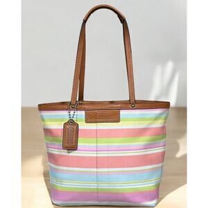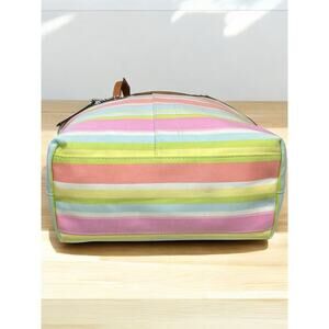 This Y2K Coach F13552 Hamptons Twill Stripe Tote Bag and Graffiti Script Large Wristlet from 2009 is so cute and perfect for summer! The bag features multi -colored striped twill with brown leather straps/trim and graffiti script lining and the wallet matches the interior lining of the tote. If you love bright, colorful Y2K Coach designs and quality, this is a must have for your collection!