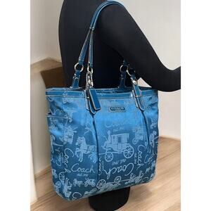 This Y2K Coach F15157 Gallery Horse & Carriage Tote and Turn lock Checkbook Wallet from 2010 is such a great, vibrant color! Featuring electric/teal blue Horse & Carriage sateen this tote set is just as stylish and sought after today as it was 15 years ago. Rare to find a matched set in this color and if you love the style and quality of Y2K Coach, you need this set in your collection!