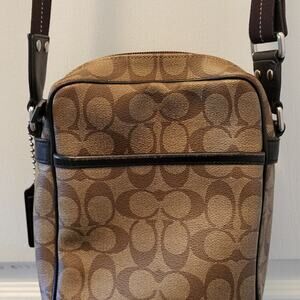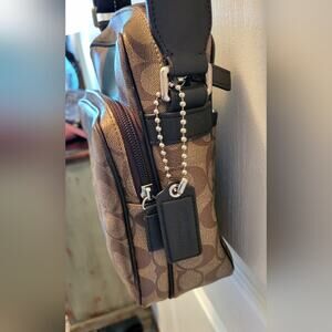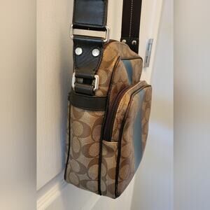 Elegant Coach messenger bag with signature pattern and features a bold blue stripe. Ideal for daily use.