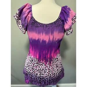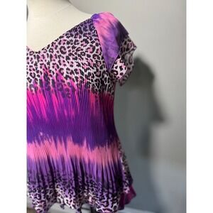 Piano Womens Top L Leopard Print Tie Dye Pleated Ruffle Short Sleeve Purple Pink
