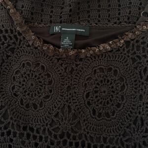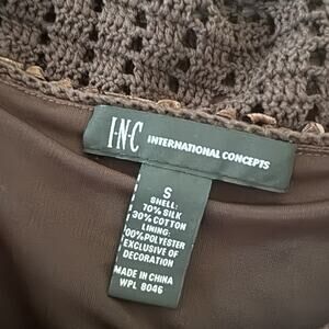 Beautiful brown crochet tank top by INC with a soft silk-blend shell and full lining. Features intricate floral crochet patterns and a delicate sequin-trim neckline that adds a subtle shimmer. Adjustable straps, stretchy feel, and an earthy boho silhouette. Perfect layered with a maxi skirt or styled for festival, Y2K, cottagecore, or fairy-inspired looks. Lightweight, comfortable, and great for year-round styling.