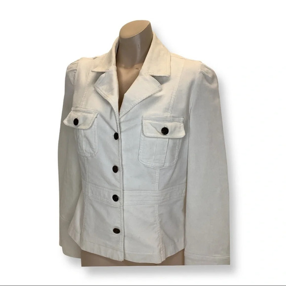 Jacket has two front pockets with button closures. Back has back slit and waist has a wide band.