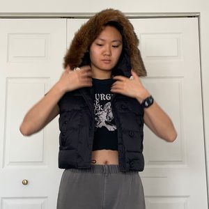 Great condition. Black cropped vest with faux fur lined hood. Front pockets. Front zipper and button detail. Hidden inside pocket. Spare button included. Size small.
