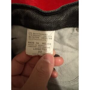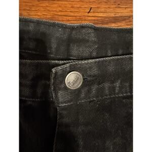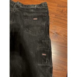 The Y2K Dickies Loose Fit Baggy Faded Black Denim Jean Shorts in size 38 are a stylish and comfortable choice for a casual occasion. These vintage carpenter style shorts feature a zip closure, 5-pocket design, and a relaxed fit. Made of cotton denim with a charcoal wash, these shorts showcase a solid pattern with accents of a button, zipper, and logo. Perfect for all seasons, these shorts embody a Western American 90s theme, making them a versatile addition to any wardrobe.