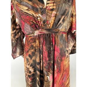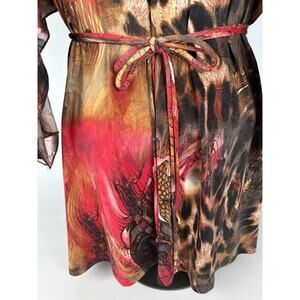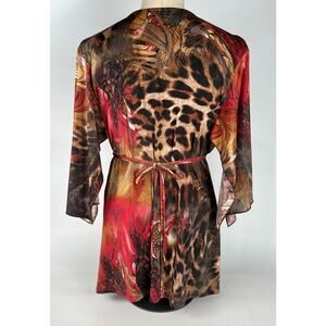 Make a bold statement in this Monroe & Main tunic featuring a rich mix of boho and jungle-inspired prints in warm tones of red, brown, and gold. The sheer overlay and flowing bell sleeves give it a relaxed, elegant silhouette. A self-tie belt cinches the waist for a flattering fit.