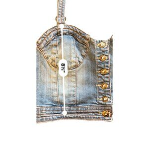 A chic denim bustier offering a trendy look with its bedazzled buttons and adjustable straps, perfect for casual or stylish outings.