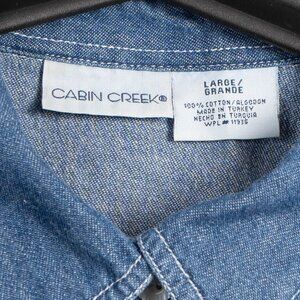 Y2K Denim Button Up Shirt L Womens Western Ruffle Cotton Blue Jean 90s MomCore